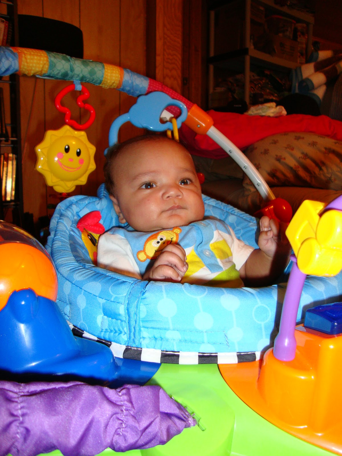 So we got another fantastic gift! This is a Baby Einstein activity jumper. Troy had just put it together and I put the boys in it the second he was finished. Tristan wasn't quite sure what to think of it. It's growing on him. Landon is a totally different story! He loves it! And he can even jump a little on his own. He can push the buttons that play the music as well (Tristan can also push the buttons). Of course they are too young to associate their action with the music but it's still fun to watch! Tristan is the one wearing the long sleeve yellow hoodie. Landon is in short sleeves.